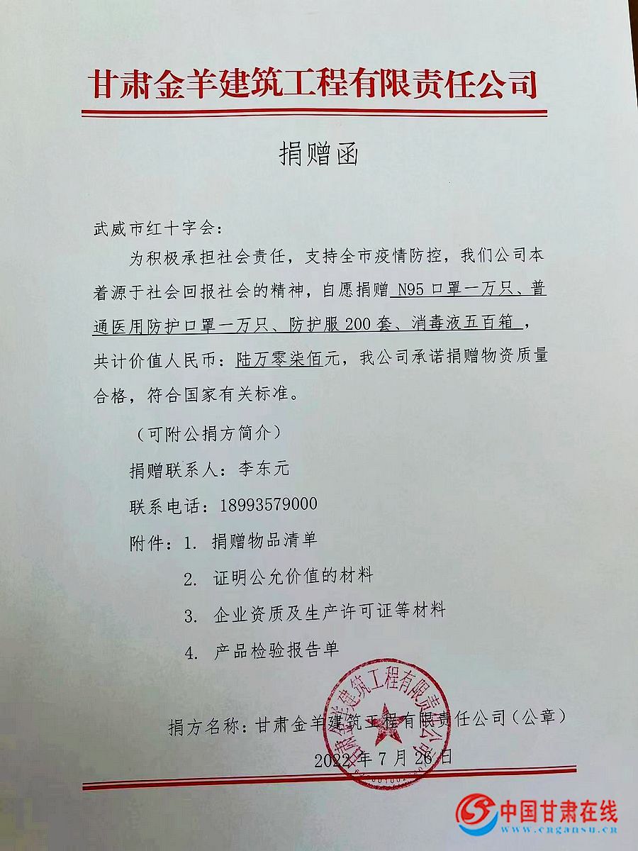 中国甘肃在线武威讯(通讯员李芬娜)目前,冠状病毒疫情牵动全国人民的心,也牵动了甘肃省武威市社会各界人士的心。2022年7月26日,甘肃金羊建筑工程有限责任公司捐赠n95口罩,医用外科口罩,医用防护服等,总价值60700元防护物资,送往武威市红十字会,负责人递交了捐赠文件,并拍照留念,为抗疫献出一份力量。