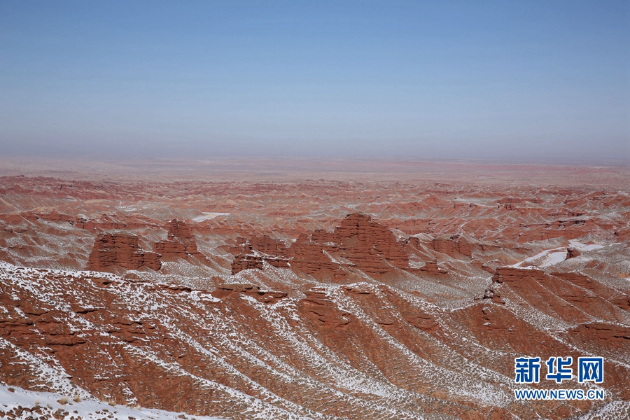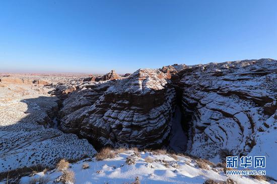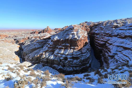 2月21日,甘肃张掖平山湖大峡谷雪后初霁,峡谷峰峦起伏、银装素裹,红色的崖壁在茫茫白雪中分外艳丽,宛若画卷,美不胜收。新华网发(成林 摄)