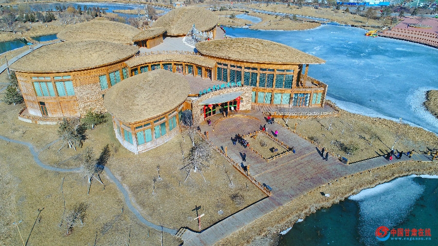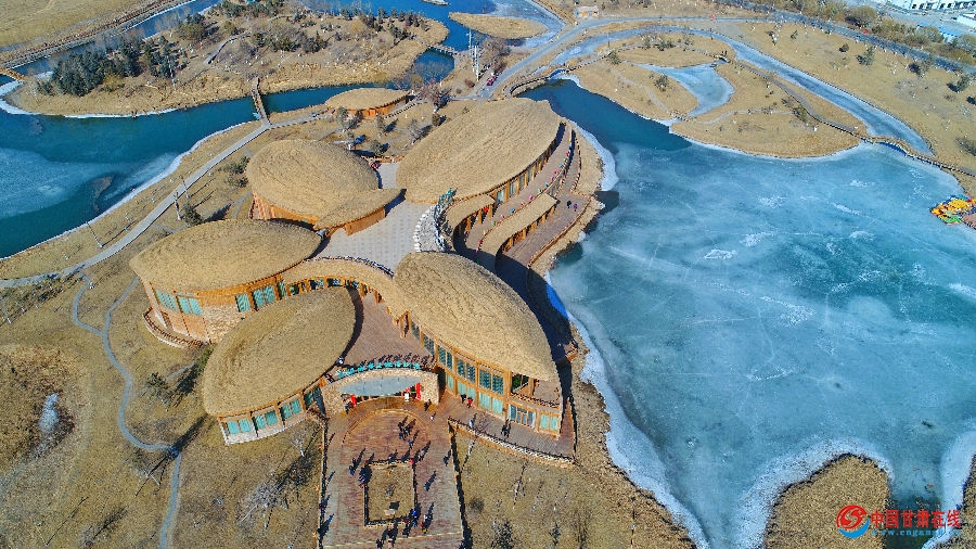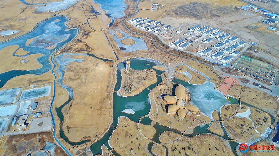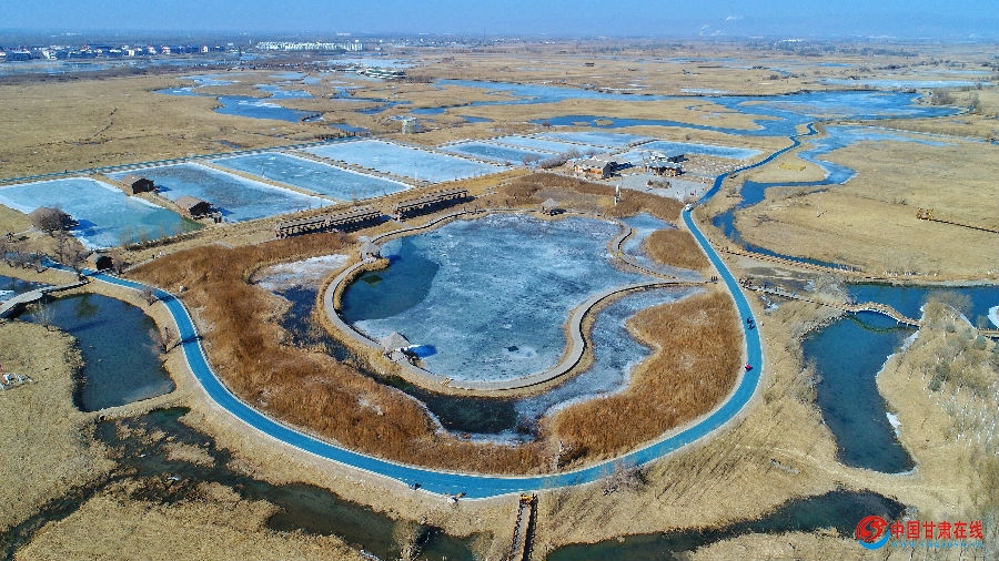 2019年2月15日,地处甘肃河西走廊中部、祁连山下的甘肃张掖市国家湿地公园内,初春景象优美如立春后,气温回升,覆盖着湿地的冰雪开始融化,从空中俯瞰,湖水、草地、冰雪构成一幅美丽的画卷。(通讯员:王超   责任编辑:赵小春)