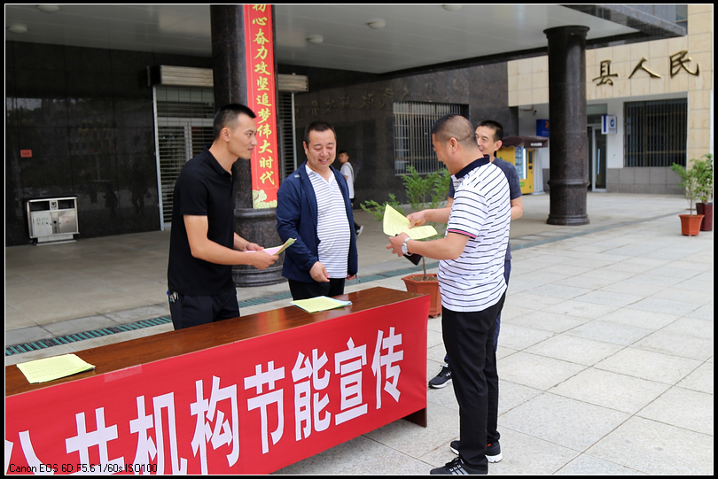 通过悬挂横幅,张贴标语,版面展示、发放节能知识等形式,积极宣传节能法律法规、普及节能知识、提升全民意识,进一步增强大众勤俭节约的生产方式、消费模式和生活习惯,在公共机构形成“人人讲节约、处处讲节约”的良好风气和“节约能源光荣、浪费能源可耻”的舆论氛围;机关干部率先垂范,珍惜每一度电、每一张纸、每一滴水、每一升油,争做勤俭节约的示范者和推动者;全县大力倡导环保健康、循环利用的办公和生活方式,广泛宣传低碳发展理念,养成绿色消费习惯;提倡垃圾分类处理,出行坐公交车,推动形成勤俭节约人人尽责,节能减排人人担当,绿色环保人人作为的社会新风尚。