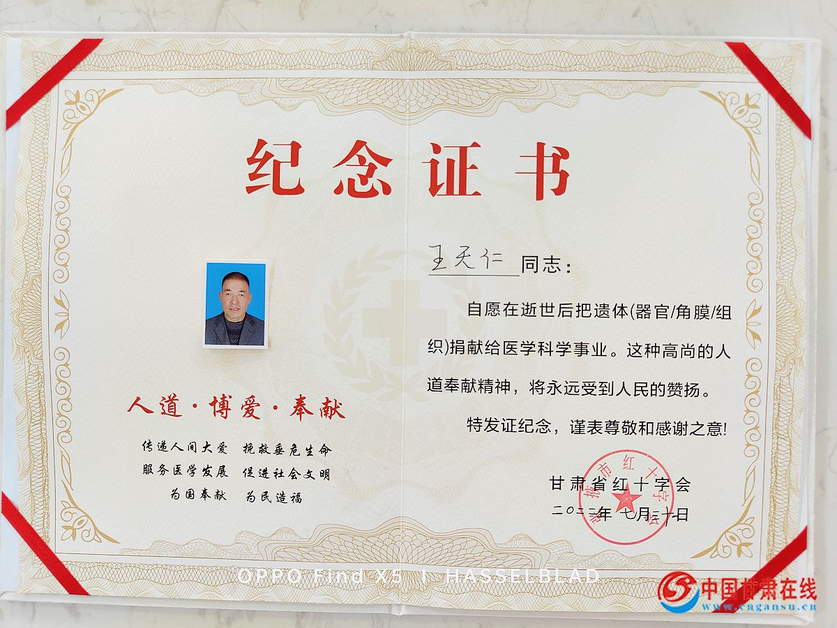 中国甘肃在线临泽讯 2022年7月31日,甘肃省临泽县鸭暖镇年近六旬的老人王天仁因患食管癌不幸离世。遵照其遗愿,王天仁家人将遗体捐献,王天仁成为我县第三例遗体捐献者。