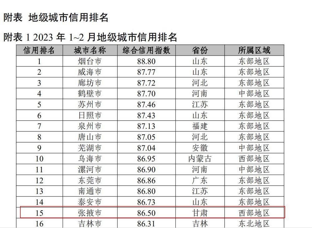 近日,国家信息中心发布最新一期《城市信用监测月报》,我市社会信用体系建设工作再传喜报,城市信用综合指数得分86.50分,位居全国地级城市第15位,甘肃省第1位,取得历史最好成绩。
