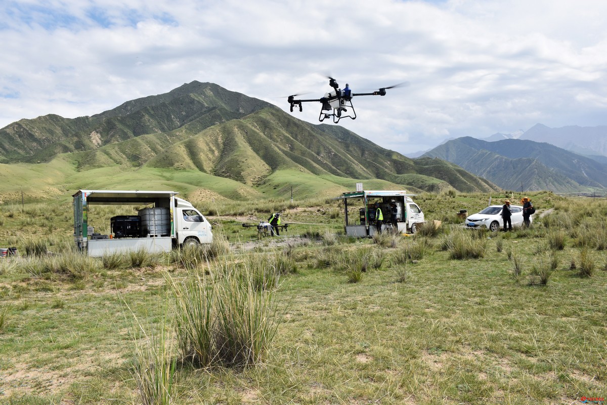 在新坝镇暖泉村退化草原修复施肥区,4台无人机搭载无机肥腾空而起,与地面上作业的拖拉机形成高效联动的“空地协同”撒施化肥作业网络。“单机载肥60公斤,日均作业500亩,效率是传统方式的3倍。”操作手杜文祥表示,这些“空中卫士”与地面机械精准配合,为草原生态快速恢复赢得宝贵时间。