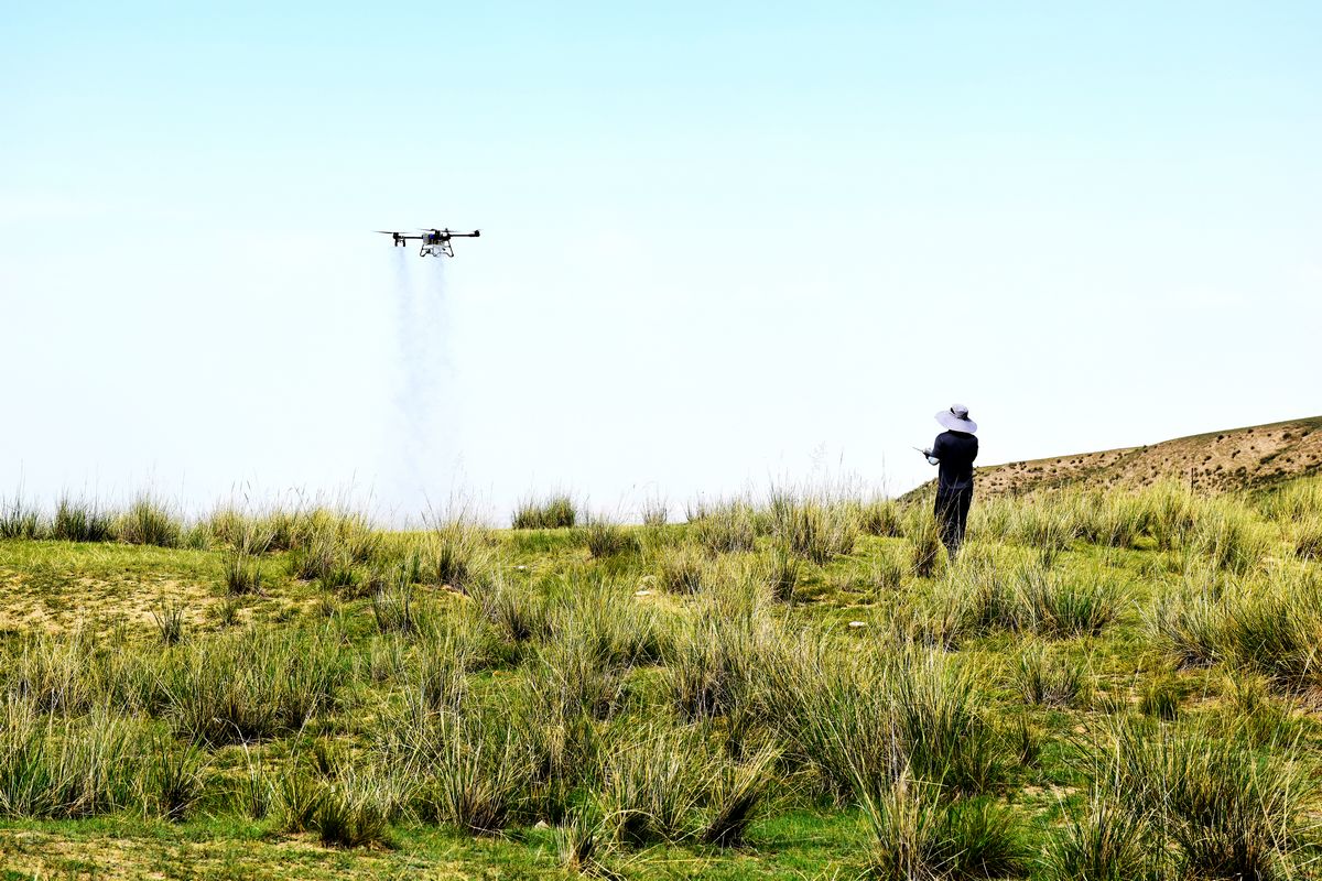 这一转变源于高台县在退化草原修复中采用的“空中+地面”协同作业模式,大型拖拉机发挥效率高、施肥施药量大的优势,牵引撒肥机和施药机在平坦区域撒施有机肥、喷洒农药;无人机则挂载肥料或农药,灵活穿梭于陡坡沟壑,精准投送至地面机械难以覆盖的区域。地面机械主攻“面”,无人机填补“点”,这种“空地互补”模式实现草原改良全覆盖,成为今年高台县三北工程林草湿荒一体化保护修复和草原植被恢复费项目实施的标配,为草原生态快速恢复赢得宝贵时间。全县全年完成退化草原修复治理29万亩、防治鼠虫害15万亩。
