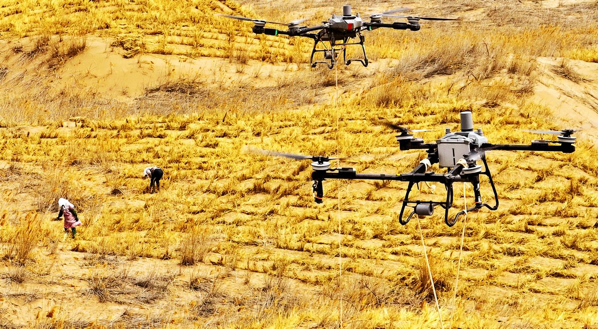 “过去治沙靠人力堆,现在靠科技拼!无人机运输效率是人工的10倍,成本降低40%,还能精准投送到车辆无法抵达的沙漠腹地。”三北工程黑河流域林草沙综合治理项目高台县西沙窝工程固沙项目施工负责人刘万德感慨道。