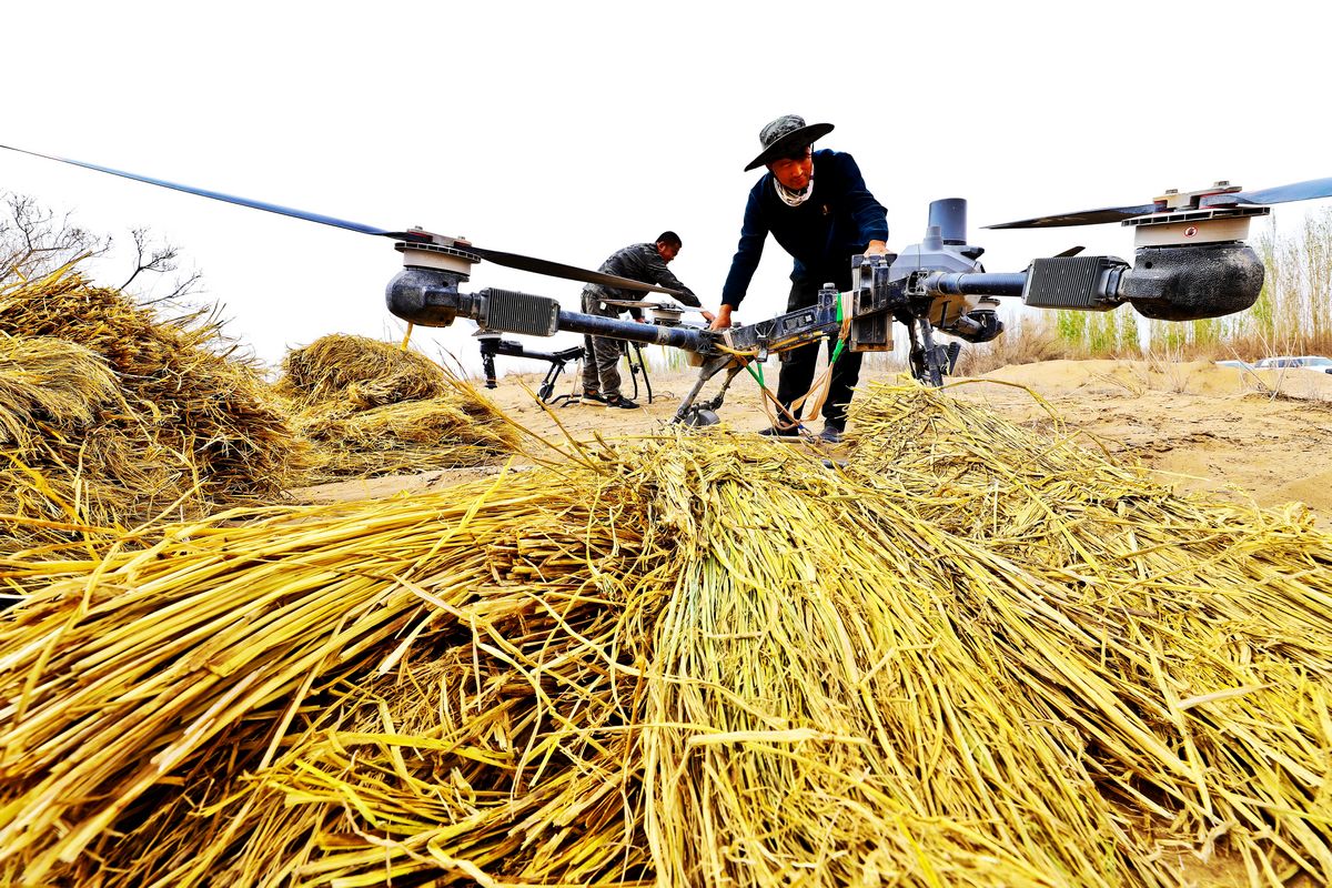 针对沙漠腹地车辆难入、传统运输效率低下的痛点,高台县在三北工程固沙项目中大力推广“无人机吊运稻草”技术。通过GPS定位系统,无人机实现“点对点”精准投放,单次飞行覆盖2公里范围,日均投送稻草10吨,草方格铺设效率提升3倍。昔日施工人员肩扛人背、单日作业不足2亩的困境,如今60余人的标段日压沙面积可达150-200亩。今年,高台县在黑泉镇西沙窝和罗城镇盐池滩完成固沙压沙2.79万亩,昔日“沙进人退”的荒漠戈壁,如今正借助科技力量实现治沙工程的“加速度”。