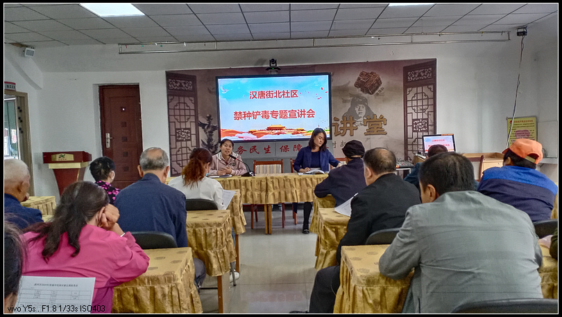 为进一步提高辖区居民的禁毒意识,扩大禁毒宣传覆盖面贺影响力,积极营造全民禁毒氛围,9月15日下午,汉唐街北社区组织禁毒志愿者、各网格员及辖区部分居民群众70余人召开禁种铲毒专题宣讲会。会上,社区工作人员用通俗易懂的语言进行宣讲,向辖区居民传