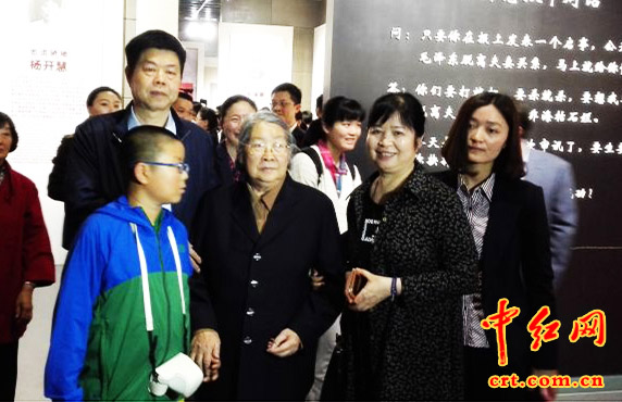 李敏(中)、毛小青(右二)、毛坚平(左二)等亲属,参观毛泽民烈士展览。(中红网红色图库)