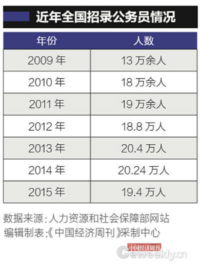 公开数据显示,从2009年到2015年,全国共录用公务员人数分别为13万余人、18万余人、19万余人、18.8万人、20.4万人、20.24万人、19.4万人。其中,2014年、2015年连续两年下降。2015年下降更多,比最高年份的2013年下降了1万人,也创下公务员国考的报名人数和录用人数3年以来的新低。