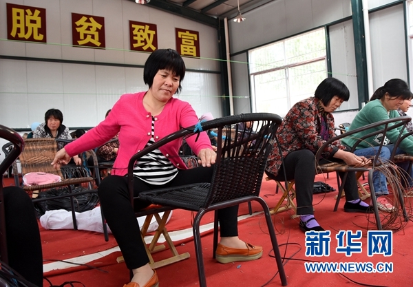 村民在鄄城县陈王街道西曹村“扶贫车间”从事藤编加工(2016年4月14日摄)。山东省鄄城县在当前开展的就业扶贫工作中,积极鼓励有条件的企业利用村小学旧址、村集体活动场所旧址和闲置的民宅,在村里设置就业扶贫点,帮助贫困群众就近就业和脱贫。新华社记者周科 摄