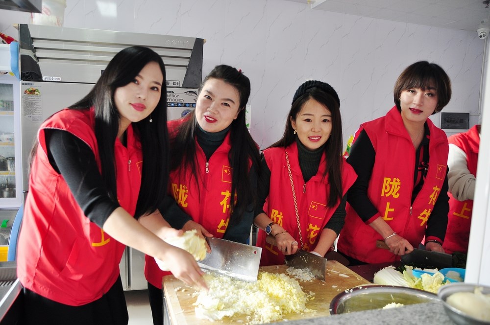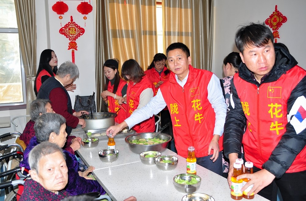 网络大V亲手为托老所老人端上亲手包的热乎乎的饺子,敬上一杯陇上花牛苹果汁