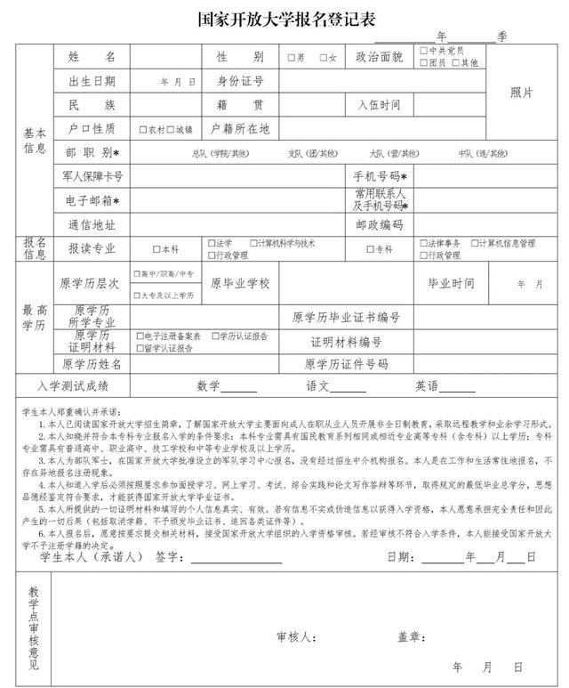 学员只能在上级机关部门通知明确的总队范围内报名。有意愿报名的士官须填写《国家开放大学报名登记表》,提交至支队管理人员。填写报名登记表时须认真阅读填表说明,保证信息完整、准确、规范。