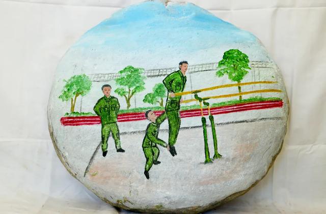 画舒胸臆,意由心生。一幅幅生动形象的石头画,反映的是官兵日常执勤、训练、生活中的点点滴滴。官兵们漫步营区欣赏画作,别有一番趣味。
