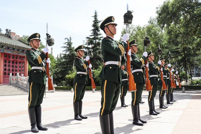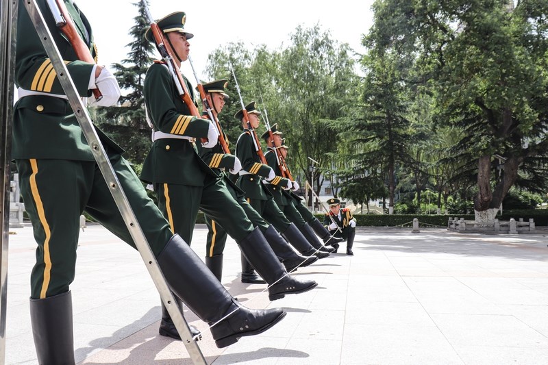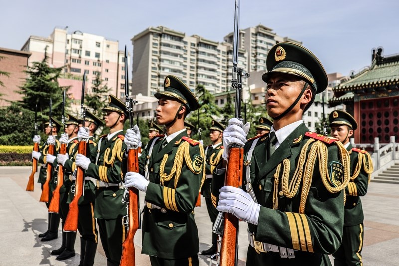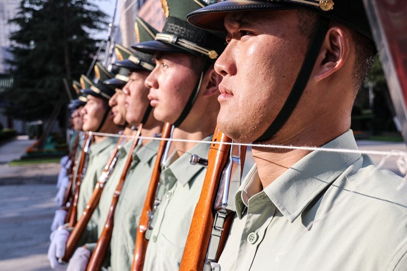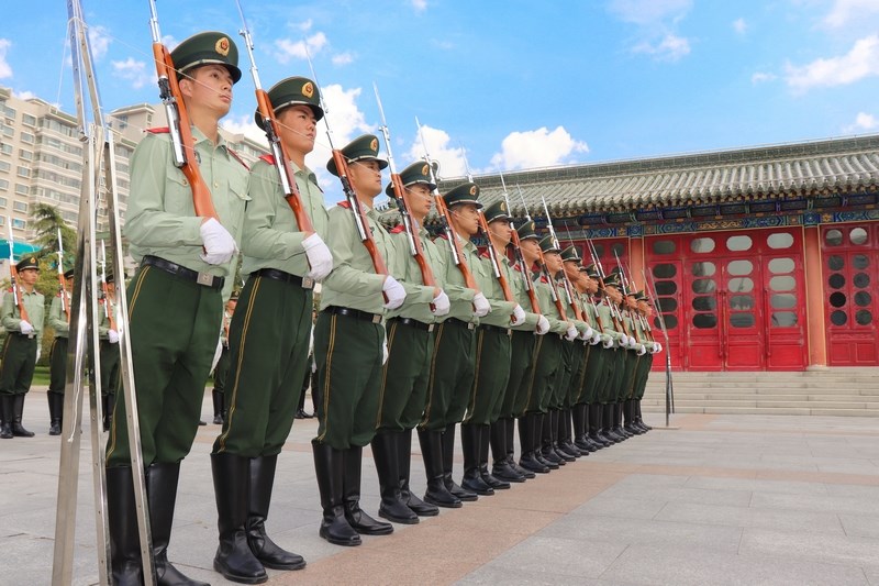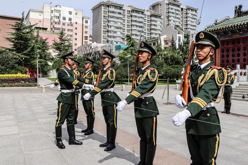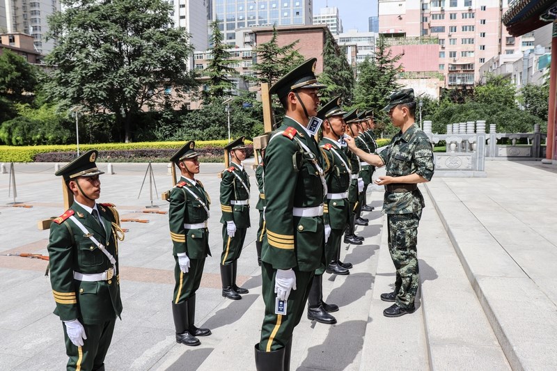 冬练三九夏练三伏,这个单位的队列训练每天都在如火如荼进行。“正步向正前方踢出约75厘米,第三名太低,第五名太高!”班长韩朝蹲在队列训练架旁边严厉的喊道。10厘米、25厘米、75厘米、110-116步······一个个精准的数字响彻在训练场中。官兵们身着礼兵服、马靴,汗水顺着黝黑的脸庞滑下,慢慢浸透衣裳,在刺眼的阳光下结成雪白的盐渍。这一幕,已经是他们司空见惯的画面了。为了帮助大家纠正痼癖动作,手掌、下颚夹扑克,枪尖挂水壶,小腿绑沙袋等“独门绝技”层出不穷,严格的训练标准下锻炼出的是横平竖直的队列,整齐划一的动作和坚韧不拔的意志。