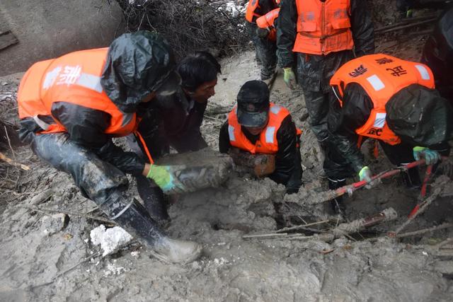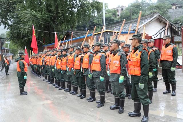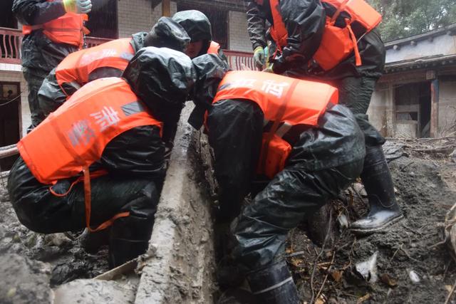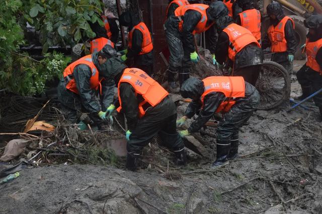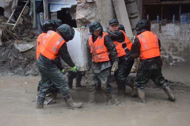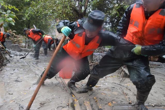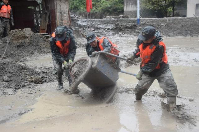 由于道路泥泞,雨水湿滑,不少战士重重跌倒在泥水里,满身泥水。跌倒了,就立即爬起来,继续投入到紧张的救援中。风雨中,武警官兵们喊着响亮的口号,在救灾现场展现人民子弟兵的忠诚担当。