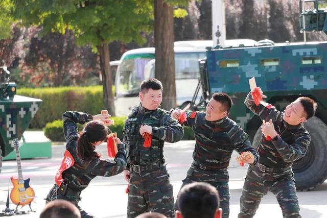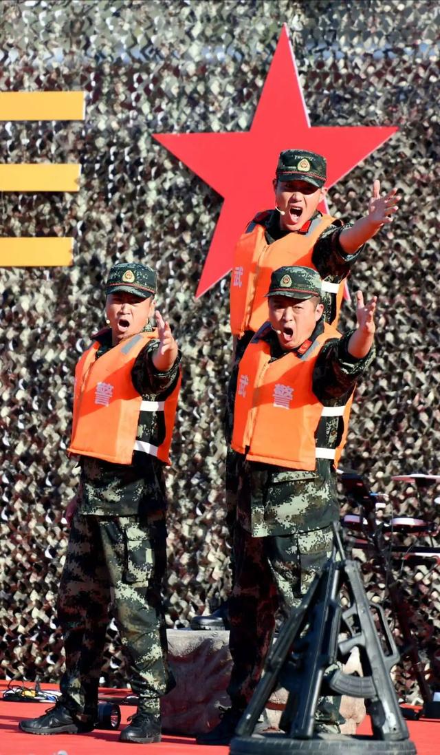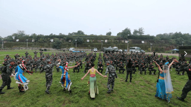 没有绚丽多彩的舞台,没有五花八门的道具,演员们一身迷彩,在训练场、岗哨前、阵地旁深情演出。歌曲《好男儿就是要当兵》《我在沙场等着你》《旗帜更鲜艳》让现场的官兵热血沸腾;舞蹈《我们守卫的地方》《一声令下》不断冲击着官兵的视觉感受,直击心灵;由摇滚伴奏、女子电声乐队带来的战斗歌曲《反恐》,将整场演出推向高潮,《就为打胜仗》大合唱更是唱出了新时代革命军人慷慨豪情……队员们与官兵频繁互动,同台演出,场面十分火热。