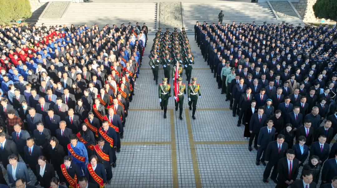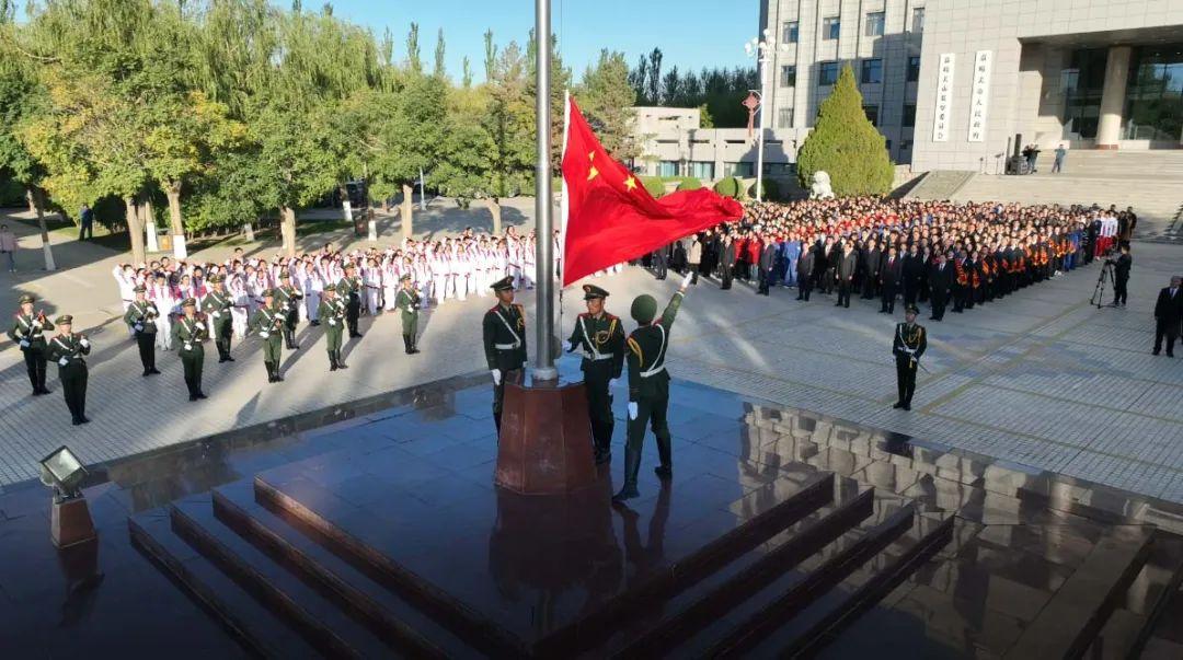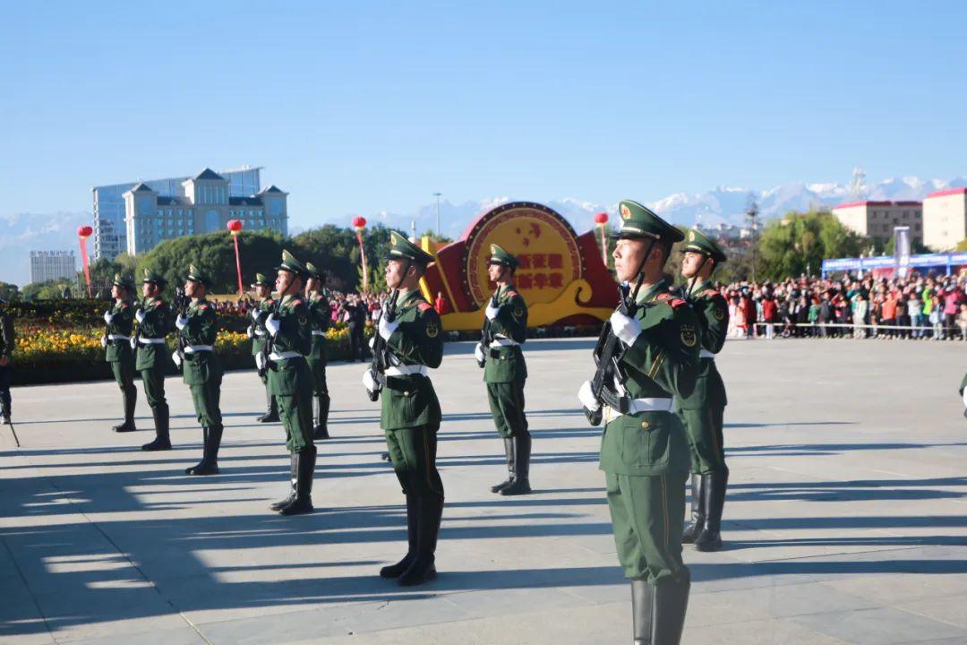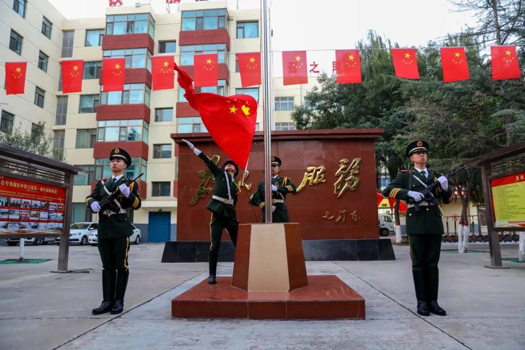 嘉峪关市隆重举行国庆升旗仪式,嘉峪关支队官兵担负升旗礼兵任务。“齐步——走!”随着一声嘹亮的口令,国旗护卫队队员迈着矫健整齐的步伐,护卫着五星红旗走向升旗台,升旗手振臂一挥,鲜艳的五星红旗冉冉升起、迎风猎猎。全体人员整齐肃立,对伟大祖国致以无限敬意和深深祝福。