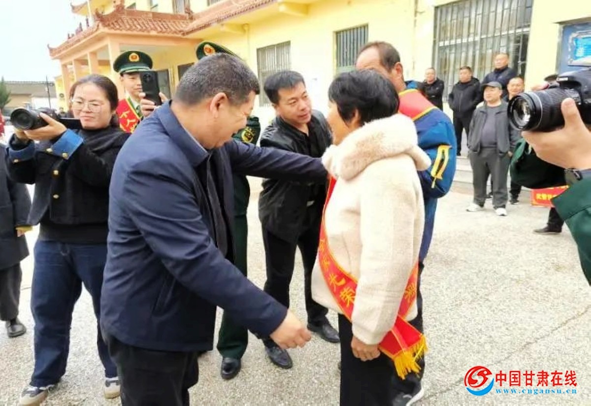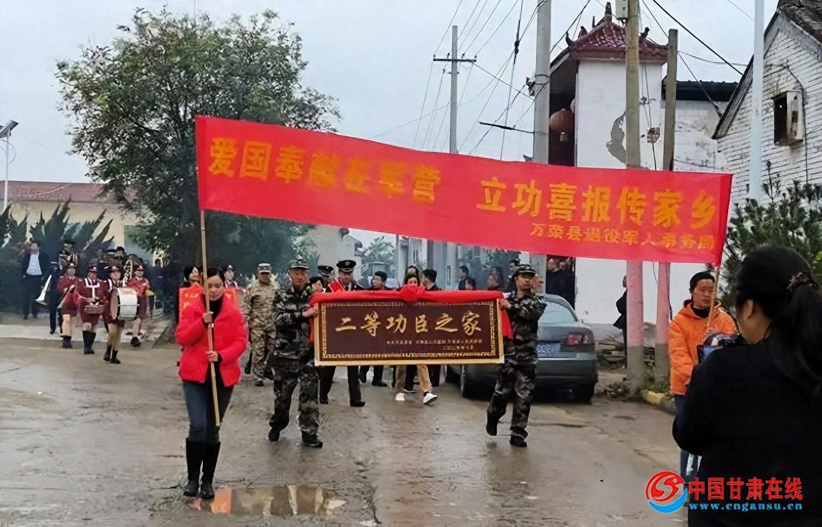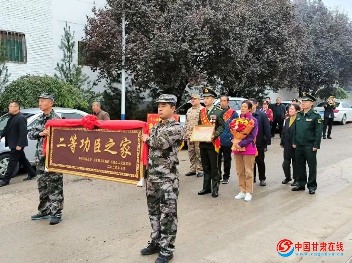 中国甘肃在线讯(文/图 许鹏 曲浩鹏 马俊松)近日,武警甘肃总队临夏支队联合万荣县人民政府开展登门送喜报活动,为荣立二等功的孙晓洋同志家送去立功喜报。锣鼓声声,喜气盈门,报喜队伍高举“爱国奉献在军营 立功喜报传家乡”的横幅,抬着熠熠生辉的“二等功臣之家”牌匾,在邻里乡亲的见证下,送到孙晓洋家中。