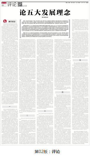 今天出版的中共广东省委机关报《南方日报》,以一个整版的篇幅刊发长篇评论员文章:《论五大发展理念》。文章系统回顾了中央领导人关于发展的一系列重要思想、观点和论述,并密切联系广东实际,全面阐述五大发展理念的深刻内涵。