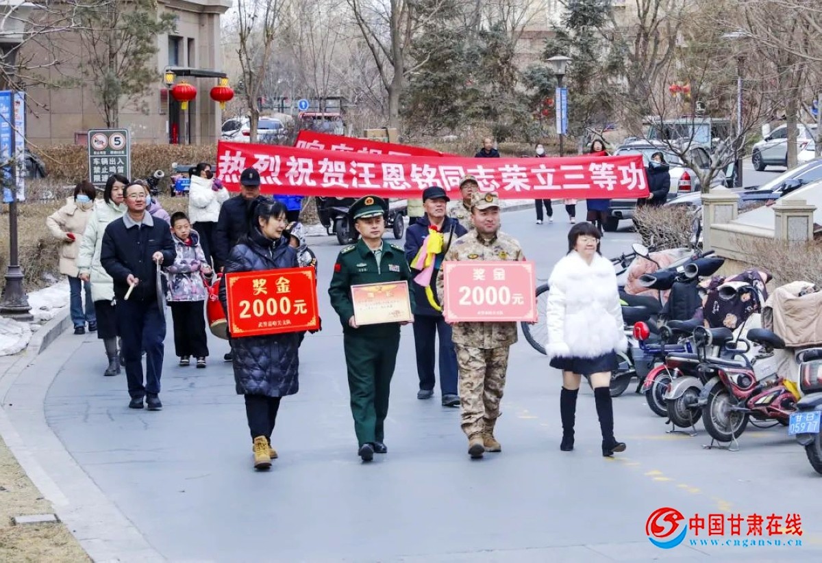 中国甘肃在线讯(文/图 何腾云 赵雨豪报道)军营建功勋,家乡传美名。近日,武警甘肃总队嘉峪关支队联合地方退役军人事务部门,共同开展“登门送喜”活动,为功臣之家送去特殊的“新年礼物”。在嘉峪关市阳光金水湾小区,得知部队要为汪恩铭送喜报上...