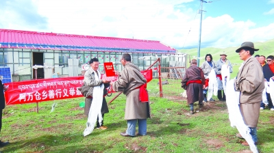 当地牧民向特布考(左一)献哈达。 本报记者徐俊勇  据甘肃日报报道 “尼布桑”,藏语“好人”的意思。在玛曲草原就有这样一位被牧民传颂的“尼布桑”。10年前,他作出了一个大胆的决定,将牧民当作“命根”的牛...