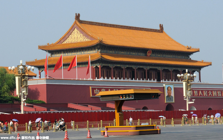 2015年8月9日,北京,天安门城楼前东西两侧竖起了红色围挡,开始搭建93阅兵式临时观礼台,迎接抗战胜利70周年纪念日的到来。  天安门广场竖起施工围挡开搭“93”阅兵式临时观礼台  天安门广场竖起施工围挡开搭...