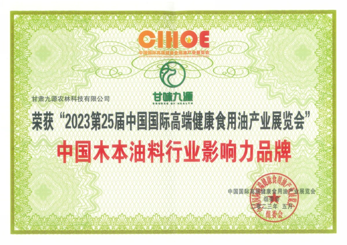 5月28日,甘味九源核桃油参加第30届CIHIE.健博会获得农业品牌创意新星奖;同天荣获“2023第25届中国国际高端健康食用油产业展览会中国木本油料行业影响力品牌