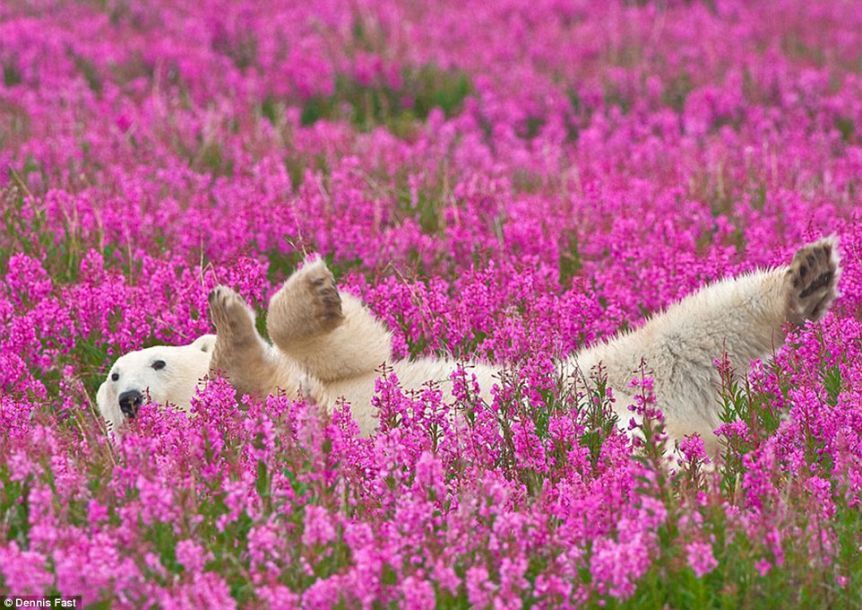 加拿大摄影师法斯特(Dennis Fast)是在马尼托巴省(Manitoba)北部哈德逊湾附近捕捉到这些让人惊叹的照片。画面中这些玩心未泯的白熊正在恣意享受夏日和煦的阳光。在花丛中伸懒腰,恣意的滚来滚去。