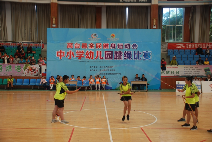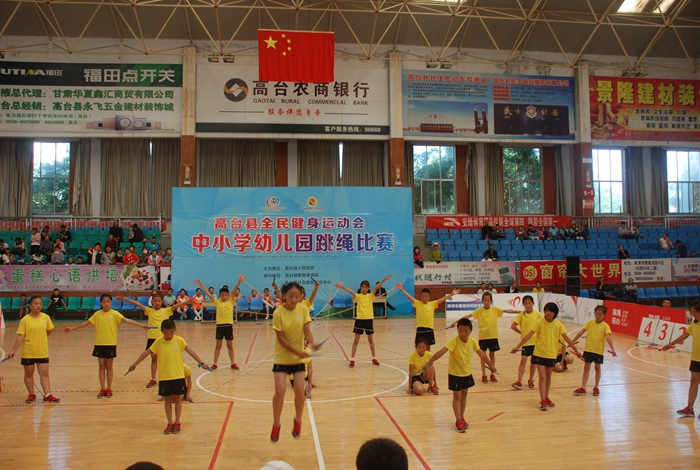 9月14日,由高台县人民政府主办,教育体育局承办的“高台县中小学幼儿园跳绳比赛”在体育馆举行,来自全县幼儿园、中小学的近300名运动员参加了幼儿组、小学组、初中组、高中组30秒单摇、30秒双摇、30秒一带一单摇、4X30秒单摇接力、3分钟10人8字跳以及集体花样跳绳比赛。