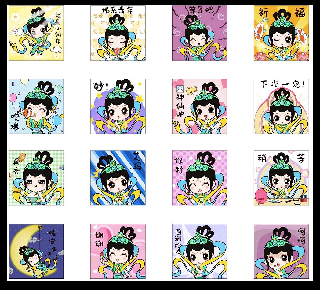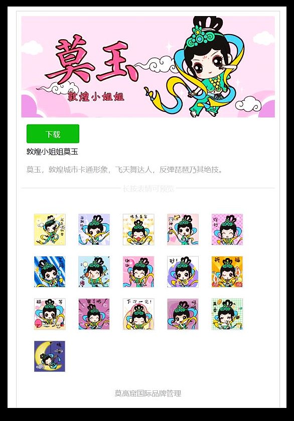 徐明老师表示,敦煌小姐姐“莫玉”结合流行的Q萌的设计思路,在还原敦煌壁画的基础上提高了颜色的饱和度和明度,设计了“莫玉”的商业运用图库,近期还会在微信表情商店同步上架16个动态表情满足敦煌迷的下载需求,并通过核心原创团队打造优质动漫内容,通过专业资深的IP创作运营团队实施精准市场营销宣传和品牌推广,将敦煌小姐姐“莫玉”打造成有粉丝号召力的超级IP。