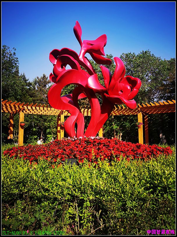大雨过后的清晨,空气显得格外湿润,不断修建的马路两旁间或有工人在绿化带边修剪着枝叶。红的花绿的叶,谈笑间来到了第一个观景点——牡丹亭,在以种植牡丹为主的中心广场处一朵鲜艳欲滴的以“花开富贵”主题的雕塑与文化长廊,突现了牡丹园的文化内涵。以广场为中心延伸出去的三条木栈道,让前行的我们左右摇摆不定,无法定夺的时候那就居中而行,于是我们就看到了牡丹亭北侧护坡处,展示牡丹主题文化的那面“仙子送福”浮雕。