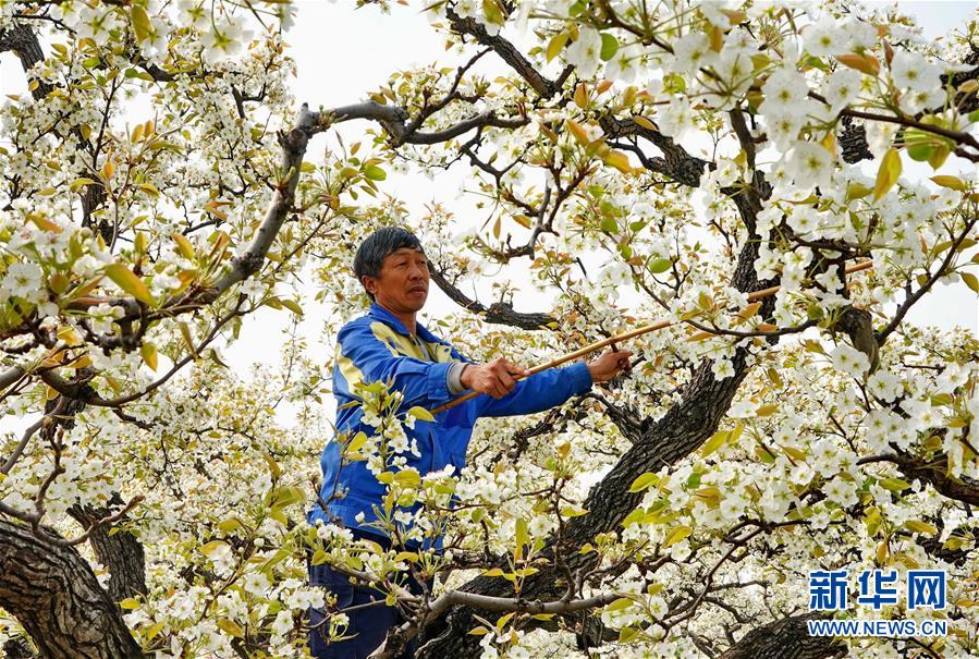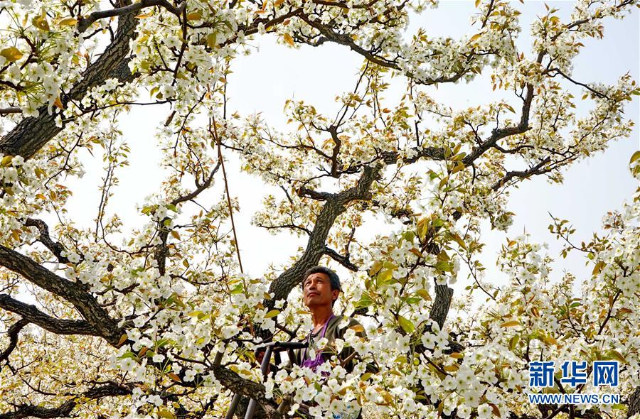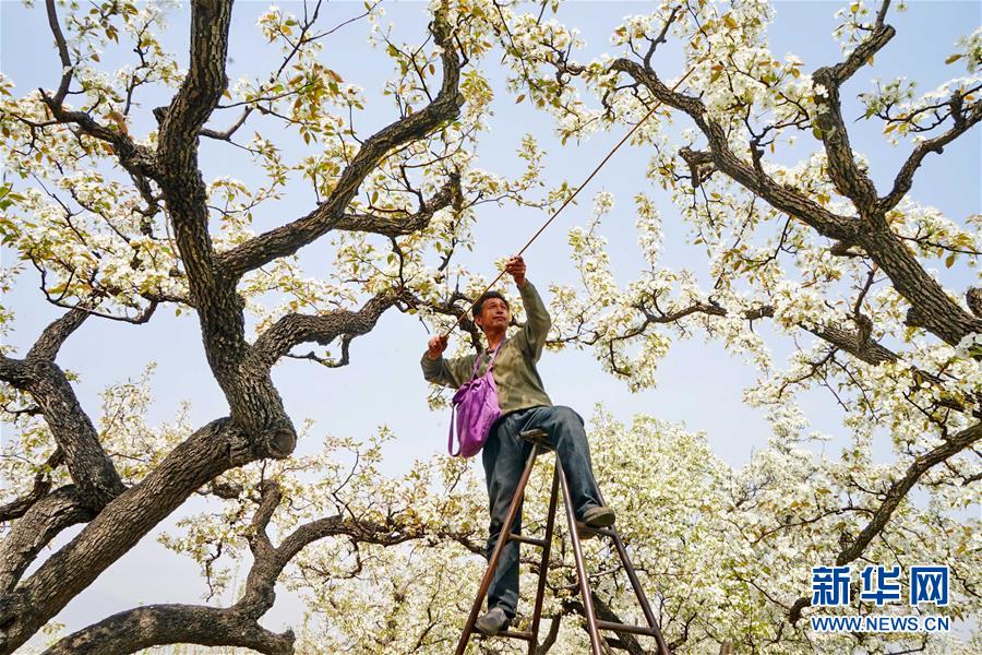 4月19日,昌黎县两山乡正明山村的果农在百年梨园内给果树授粉。