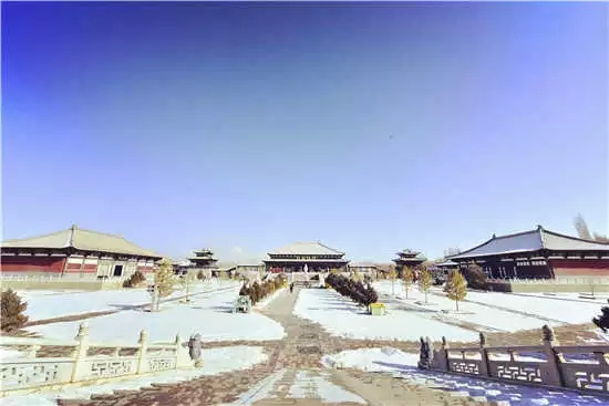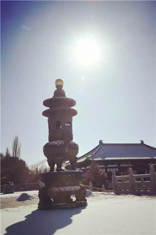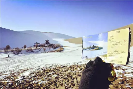 而此时的雪沙山展露出的是一种更美更纯的矜持气质。莫高楼阁在雪白中透出它原有的色彩,漫山白雪掩盖了漫漫黄沙,行走在小道之间,感觉着绝对的宁静。