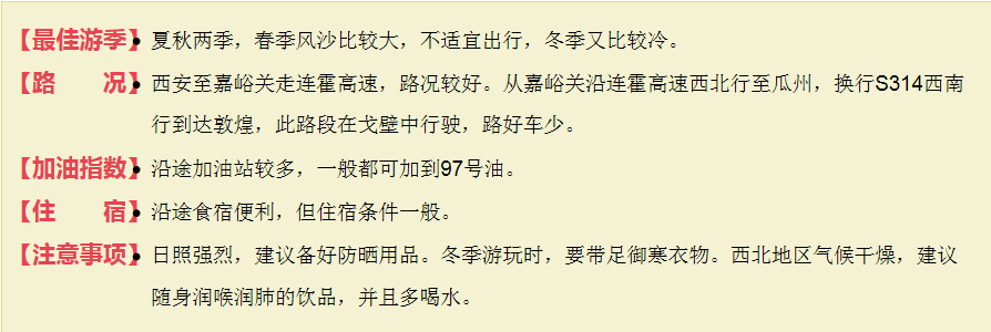 从西安出发行驶约177公里到达宝鸡,被称为“炎帝故里、青铜器之乡,佛骨圣地、社火之乡,周秦文明发祥地、民间工艺美术之乡”。著名景点有七彩凤县、法门寺、太白山、关山草原、红河谷、望鲁台、九成宫等,可一一游玩。 ![]() 太白山从宝鸡出发行驶约172公里到达天水,天水市是甘肃省第二大城市,位于甘肃东南部,自古是丝绸之路必经之地。现有国家和省、市级重点保护文物296处,境内文化古迹甚多,可以去国内唯一有伏羲塑像的天水伏羲庙,或者中国四大石窟之一、号称“东方雕塑馆”的麦积山石窟。其他还可以去大地湾遗址,水帘洞石窟,和南郭寺。 从天水出发行驶约306公里到达甘肃兰州,兰州是唯一黄河穿越市区中心而过的省会城市,市区依山傍水,山静水动,形成了独特而美丽的城市景观。到了兰州一定要去有“天下黄河第一桥”之称的中山桥留个影,并且可以去白塔山公园,白塔山公园正下方就是中山桥,是观赏兰州景色的绝佳之处,“铁桥白塔”也是兰州胜景之一,“站在桥上放眼可远眺白塔入云,收目可近观母亲河穿桥而过,在中山桥附近的桥南广场上也可将中山桥与白塔山的美景尽收眼底。兰州还有其他五泉山公园,八盘峡等著名景点。 ![]() 玉门关从兰州出发行驶约509公里到达张掖市,张掖市位于中国甘肃省西北部,河西走廊中段。自古有“金张掖、银武威”之美誉。土特产品有元葱、苹果梨、乌江米、红枣、发菜、丝路春酒等。市内有大佛寺、木塔寺、镇远楼、黑水国遗址等名胜古迹。 从张掖市出发行驶约226公里到达嘉峪关市,嘉峪关市有景点嘉峪关、七一冰川、西部明珠气象塔等,最为著名的是被誉为“天下第一雄关”的嘉峪关。 从嘉峪关出发约6小时20分钟到达敦煌市,敦煌位于古代中国通往西域、中亚和欧洲的交通要道——丝绸之路上,曾经拥有繁荣的商贸活动。以“敦煌石窟”、“敦煌壁画”闻名天下,是世界遗产莫高窟和汉长城边陲玉门关、阳关的所在地。 特色美食![]() 哨子面庆阳民间传统膳食臊子面,因其太辣,吃在嘴里不断发出嘘嘘哨声,故又称“哨子面”。 庆阳臊子面制作独特,吃法有趣,堪称一绝。正如一首民歌唱到“十八省里(那个)转一遍,好不过咱们庆阳的臊子面”。 据传,庆阳臊子面源于明洪武年以后的结婚礼俗,可谓源远流长了。 |