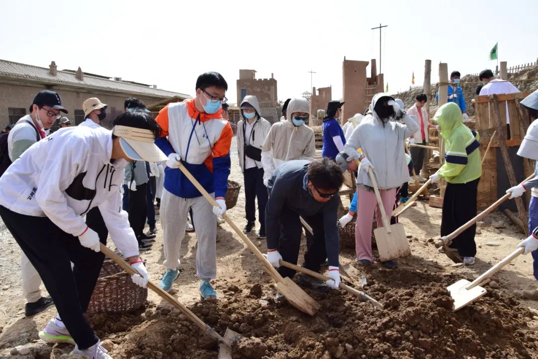 在修筑长城的研学课程中,同学们认真聆听研学导师对工具的介绍、材料的选择、工序的安排、小组的分工后,便争先恐后地进行着城墙夯筑的实践活动。
