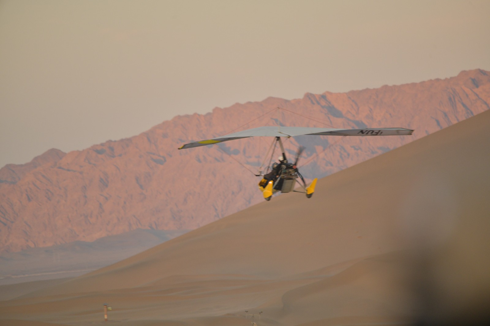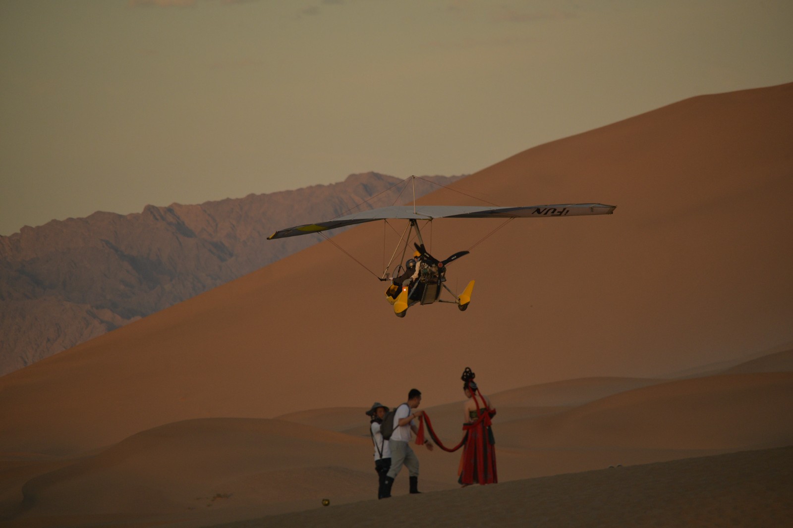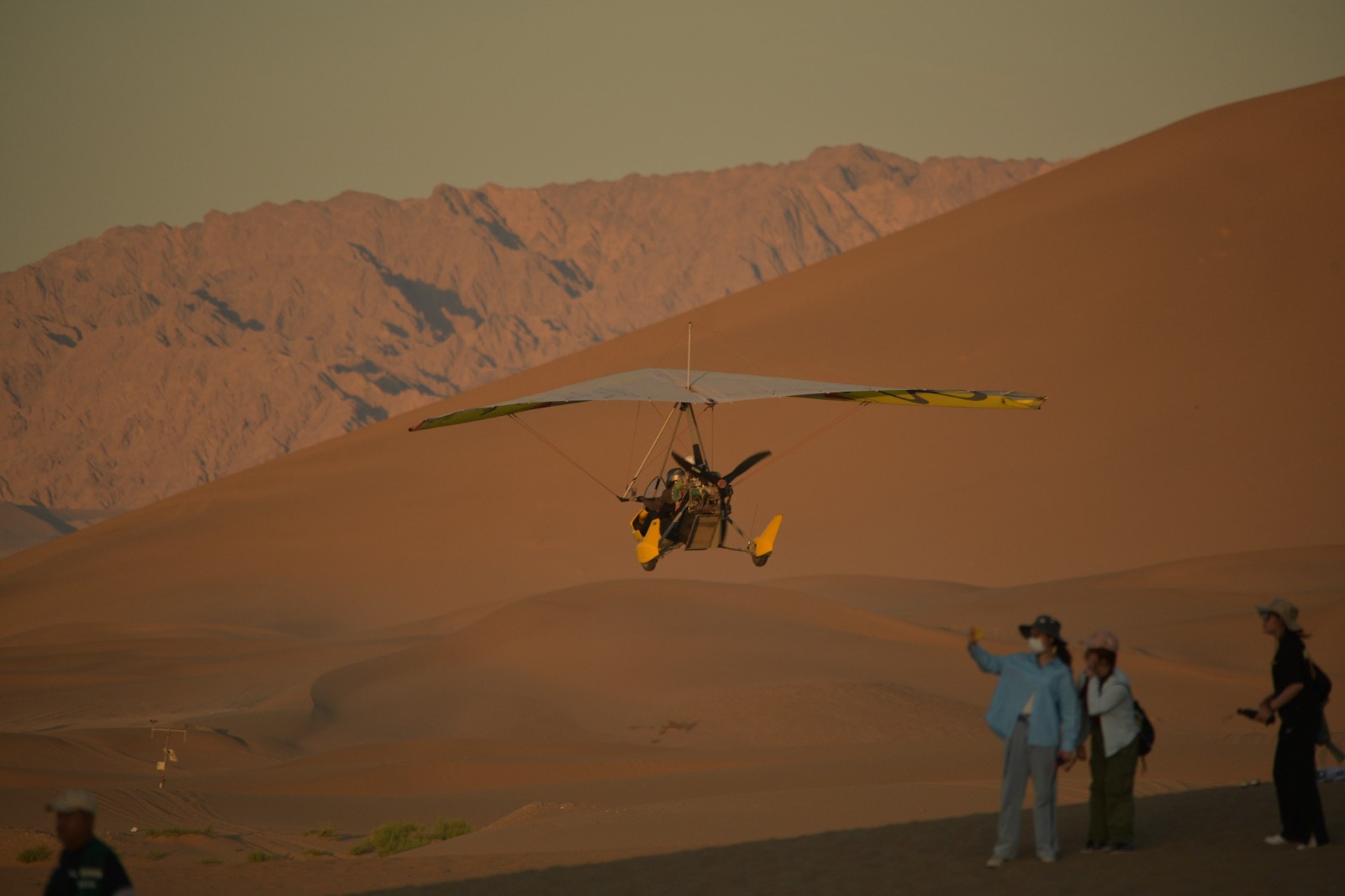 游客乘坐滑翔机空中鸟瞰敦煌大漠美景。