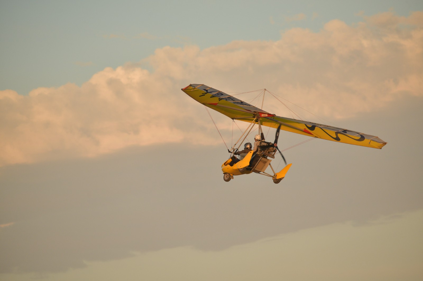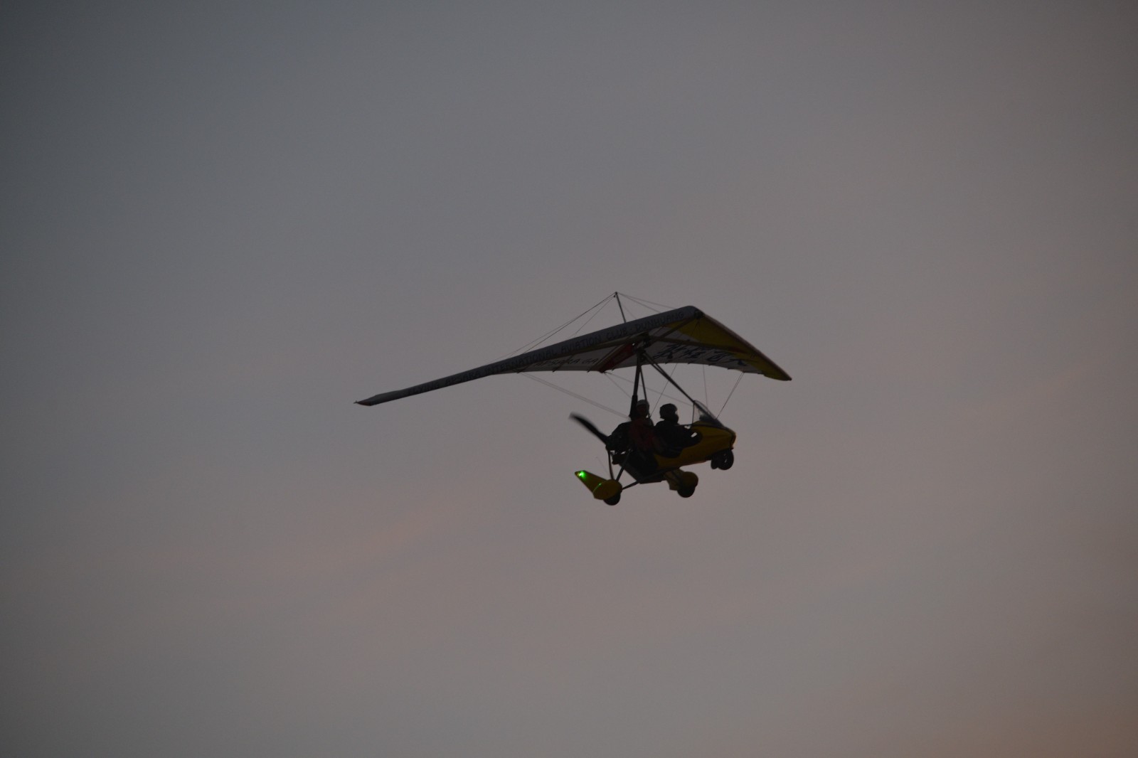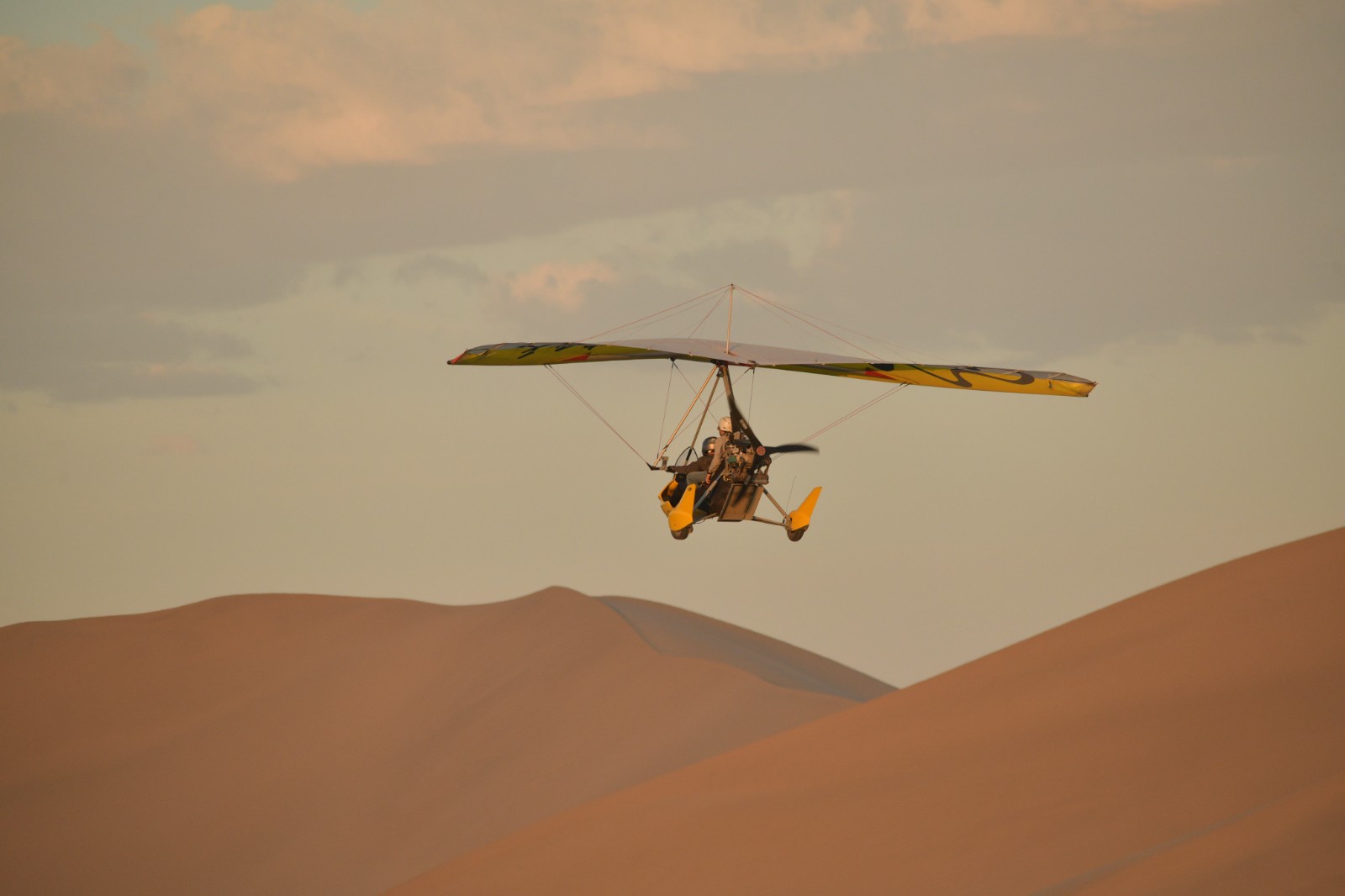 游客乘坐滑翔机空中鸟瞰敦煌大漠美景。