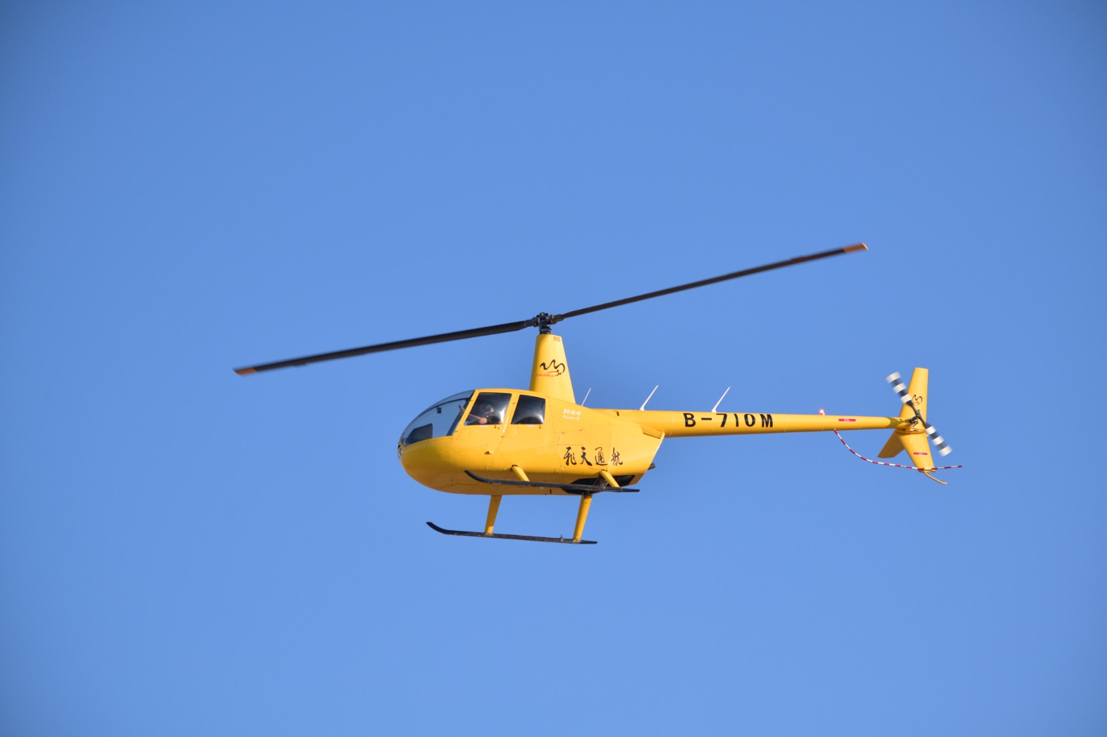 游客乘坐直升机空中俯瞰敦煌大漠美景。