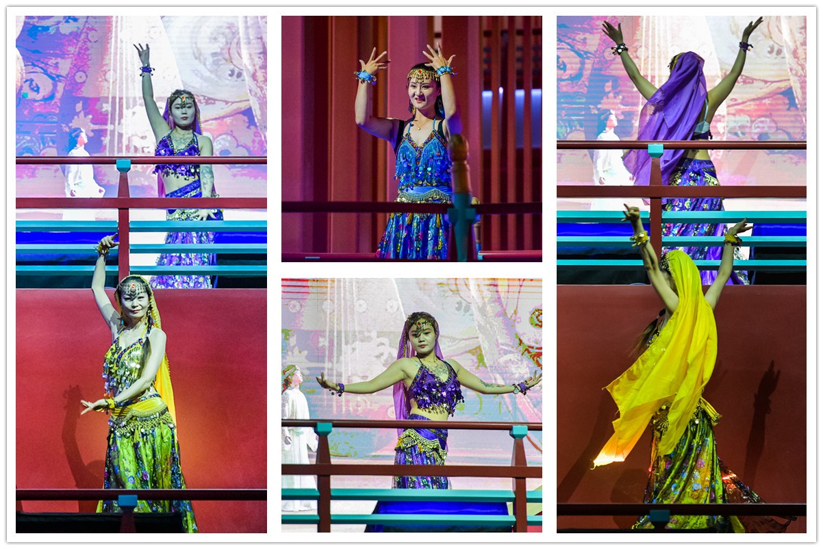 主持人和他的演艺团队款款而来,上演一处处伎乐飞天、踏鼓舞、波斯风情舞,更加增添了上元市集的欢乐气氛。让人仿佛身临其境,如沐唐风。