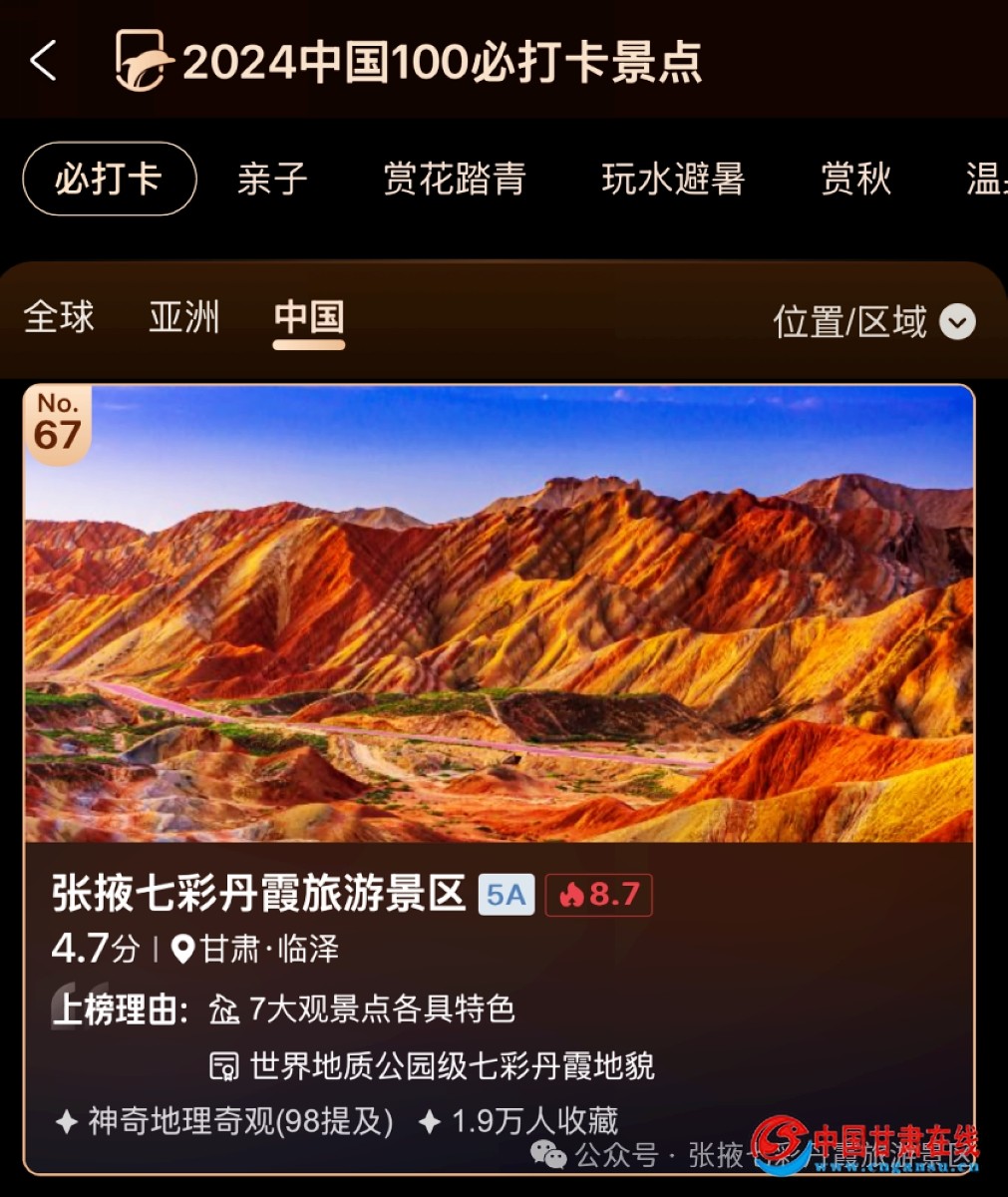 中国甘肃在线张掖讯 近日,张掖七彩丹霞景区在携程发布的口碑必打卡景点榜中脱颖而出,斩获2024携程口碑榜必打卡景点殊荣。