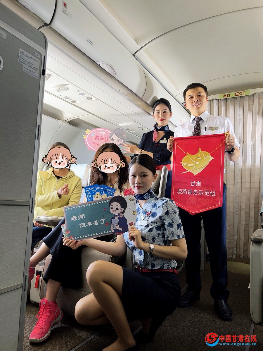 中国甘肃在线兰州讯 2025年9月10日,东航甘肃分公司“凌燕”乘务示范组在MU6804兰州-虹桥航班上,精心策划了一场教师节主题特色航班,在这个金秋送爽、硕果累累的九月,我们满怀喜悦地迎来了属于每一位辛勤园丁的节日——教师节,乘务组向航班中的教师们送上节日祝福,也为全体旅客打造了一段特别的空中旅途。