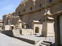 | 东千佛洞 东千佛洞又名接引寺,位于甘肃省瓜州县城东南84公里的长山子古河道两岸,与锁阳城相距22公里。现存23窟,尤以内容丰富、技艺精湛的西夏壁画称绝于世。其密宗佛教壁画弥补了莫高、榆林二窟不足,堪称西夏佛教艺术宝库。其第二窟的《密宗曼陀罗》中,观音优美的体形,露脐装,超短裙的妆饰在全国绝无仅有,被誉为中国古代"第一艳佛"。著名敦煌学家段文杰先生在国际学术研讨会上说,安西6幅《玄奘取经图》,其中东千佛洞2幅《水月观音》的发现是稀世之珍。 |