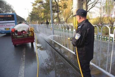 当天下午,城关区又组织万名干部职工、数千名辖区居民和志愿者等,走上街头大力开展洗城活动。记者在南滨河路走访时看到,张掖路街道的网格员正在对风情线沿线的护栏进行擦洗,被称为街道“迷你版”洒水清洗车配合网格员进行清洗,经过网格员和清洗车冲洗和擦拭,护栏在阳光映衬下显得格外光亮。而黄河北的草场街和盐场路、靖远路等多个街道干部职工、居民等同时开展着洗扫工作:不仅对小游园体育设施进行擦洗,对老旧楼院的废旧垃圾清运清扫,还铲除了沿街张贴的各类小广告。草场街社区书记马文娟说,由于社区工作人员较少,但每次开展清洗活动时,社区居民和志愿者都会主动加入到清洗队伍中,同社区10多名工作人员一起美化清洁社区环境。