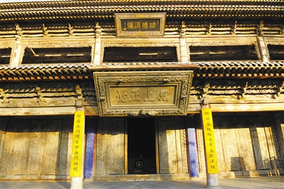 在这些木制建筑之上,还雕刻有精美的纹饰。你看,在大殿檐下的额枋处,就有龙、虎、狮、象等图案;大殿的殿门之上,各类奇花异草、楹联篆刻,即使历经900多年,还依旧保留完整,五彩的颜色也依稀可以辨认,足可以看出当年雕刻之精美,富丽之堂皇。