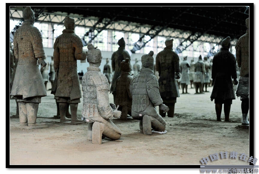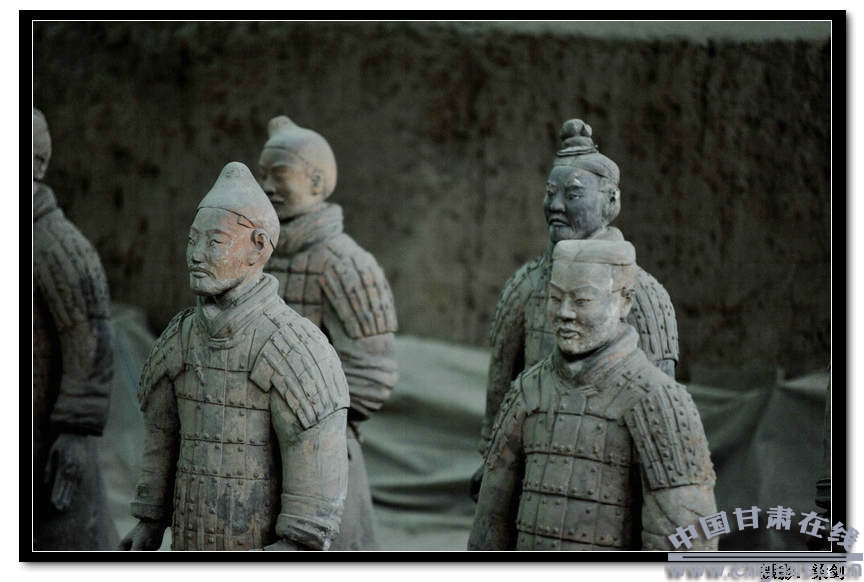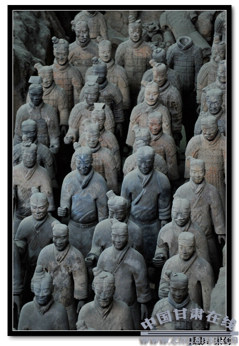 兵俑们个个凝目聆听、镇静机智,且仪态英武,有一种一往无前的英雄气概,形象地再现了秦始皇“灭六国,天下一”的雄壮军容。从身份上区分,主要有士兵与军吏两大类,军吏又有低级、中级、高级之别。一般士兵不戴冠,而军吏戴冠,普通军吏的冠与将军的冠又不相同,甚至铠甲也有区别。其中的兵俑包括步兵、骑兵、车兵三类。根据实战需要,不同兵种的武士装备各异。