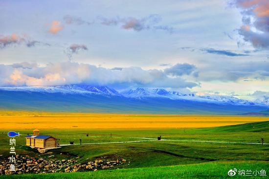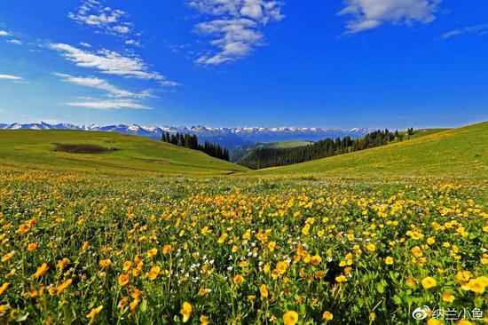 每到仲夏季节,巴音布鲁克草原层峦叠翠,绿野无限,鲜花盛开,争奇斗妍,湖沼广布,牛羊遍野,雪莲似的蒙古包坐落其间,一片兴旺繁荣的景象。