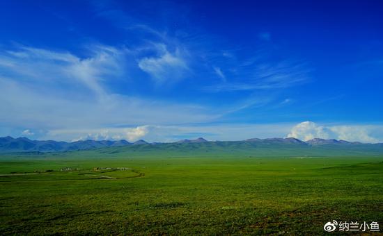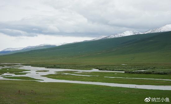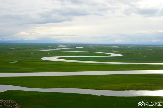 弯弯曲曲的小河蜿蜒在静谧的草地上,静静地流淌向远方。
