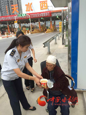 中国甘肃网7月14日讯(通讯员 窦耀辉 杨艳丽)7月12日18时15分,宝天高速公路收费管理所天水西收费站正值车流量高峰,该站当班班长郭婷在出口广场疏导车辆时,突然看见一位年迈的老太太拄着拐杖从宝鸡方向步履蹒跚的走下来,情况十分危险,郭婷看到此情此景后立即安排好车道后,箭步上前将老人搀扶至便民服务台坐下,并为老人倒水、煮方便面……,收费员的热心救助温暖了老人孤独的心。