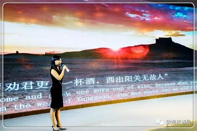 7月28日晚,敦煌市旅游局在敦煌山庄召开了敦煌旅游专题推介会,敦煌市旅游局副局长贺雁鸿女士向西班牙媒体明星团成员进行了中英文对照的敦煌旅游资源详细推介。