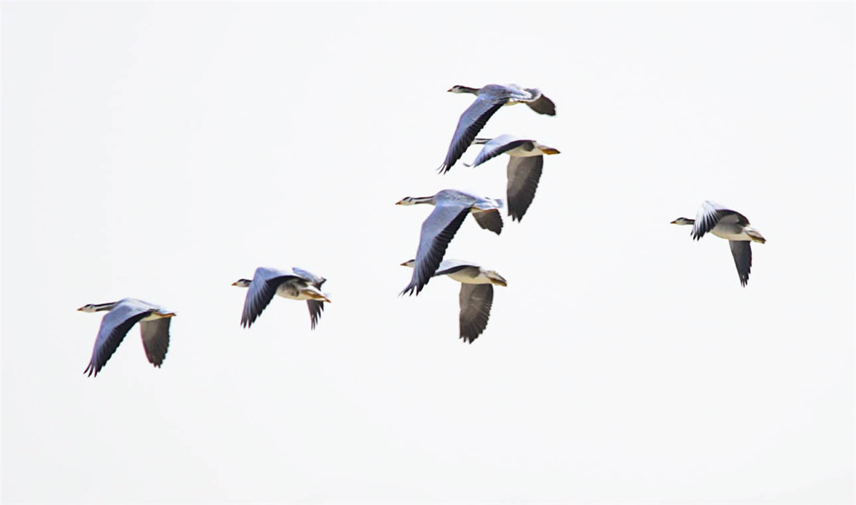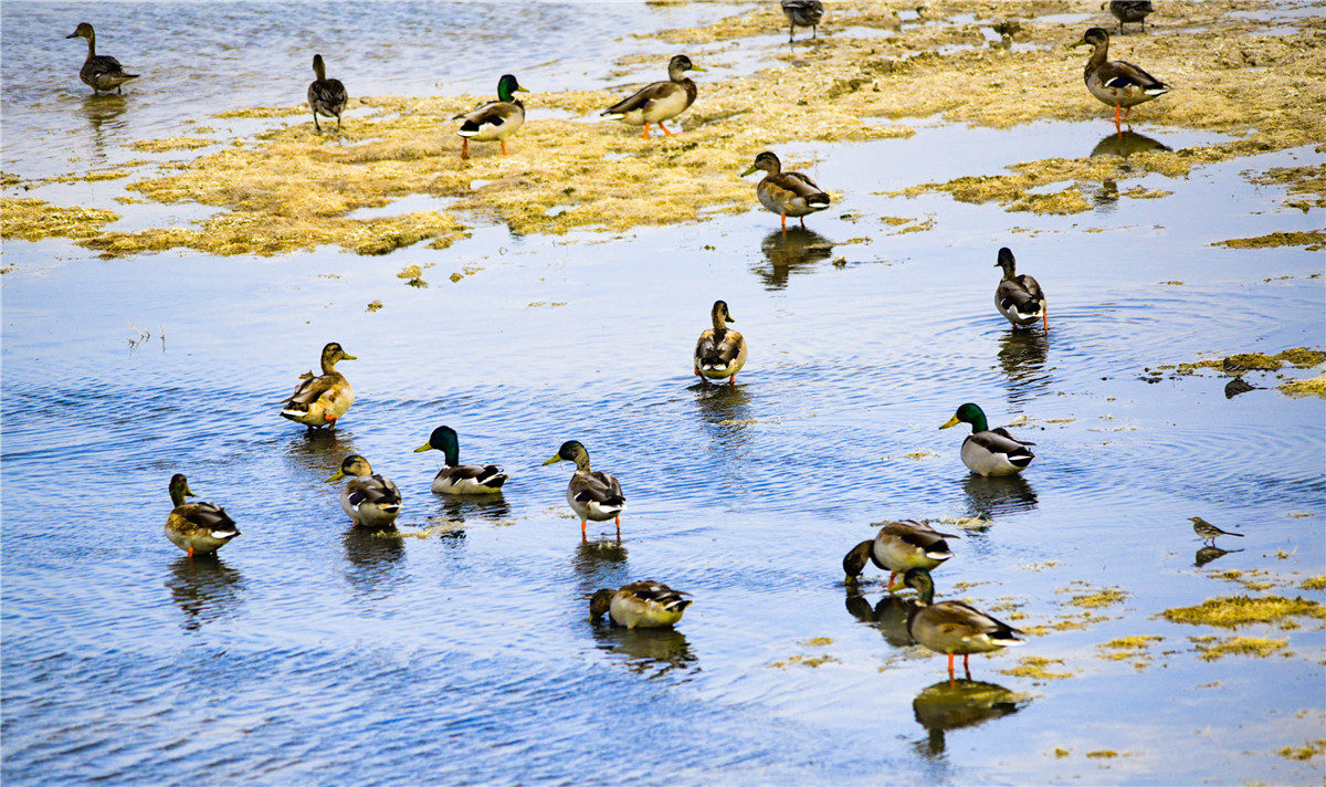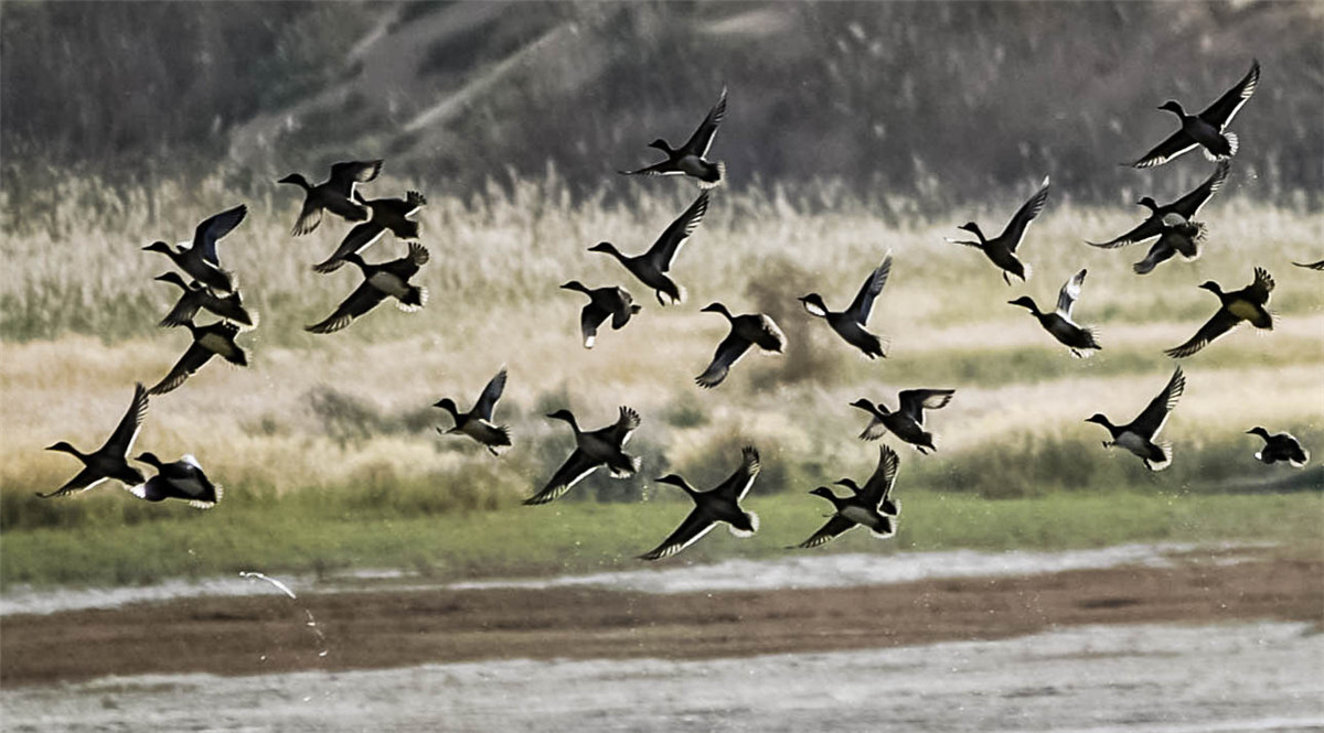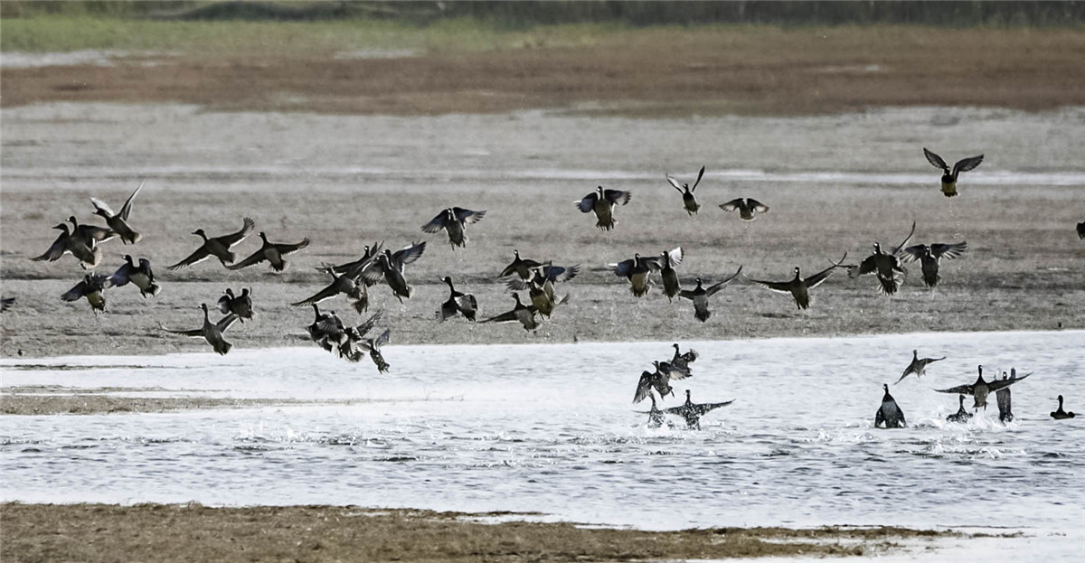 成千上万的野麻鸭、白鹭、白天鹅等鸟类在湖面上嬉戏、觅食。这些鸟儿时而在水上游走觅食,时而在天空中翱翔,飞向更远的水面停留,呈现出一幅壮美的金秋塞上风情画卷。